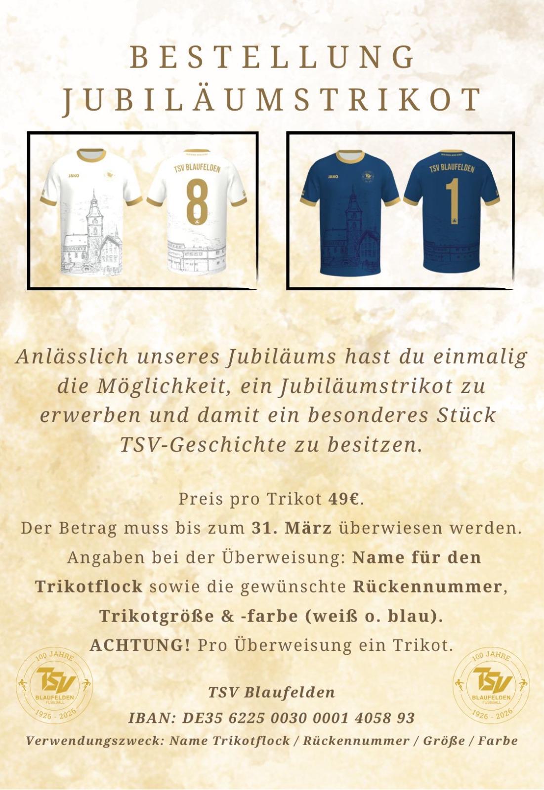 Zum 100-jährigen Jubiläum bietet sich nun die einmalige Gelegenheit, dieses exklusive Trikot zu erwerben (auch in Kindergrößen erhältlich) und damit ein ganz besonderes Stück Vereinsgeschichte zu besitzen.